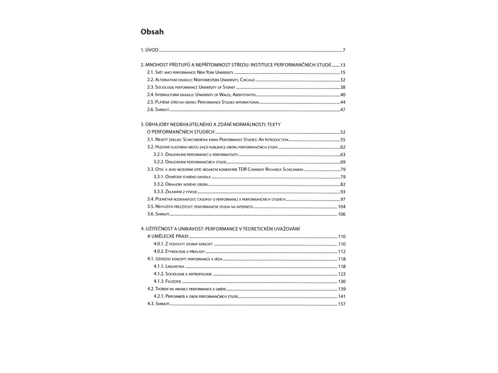 Performanční studia jsou poměrně mladým akademickým oborem, jenž se zrodil v osmdesátých letech dvacátého století v USA, a v současnosti jeho samostatné katedry existují na desítkách vysokých škol celého světa. Základem oboru je performance, jež však není chápána pouze úzce jako „představení“, nýbrž v mnohem širším smyslu jako ústřední interpretační nástroj pro porozumění lidskému chování a společnosti. Tato disertační práce se pokouší kriticky analyzovat performanční studia v celé jejich šíři a dosud neustálené podobě, prozkoumat jejich myšlenkové, společenské a umělecké zdroje, metodologii, strukturu, instituce a pedagogické postupy a snaží se pojmenovat jejich inspirativnost a možný přínos pro české akademické prostředí.